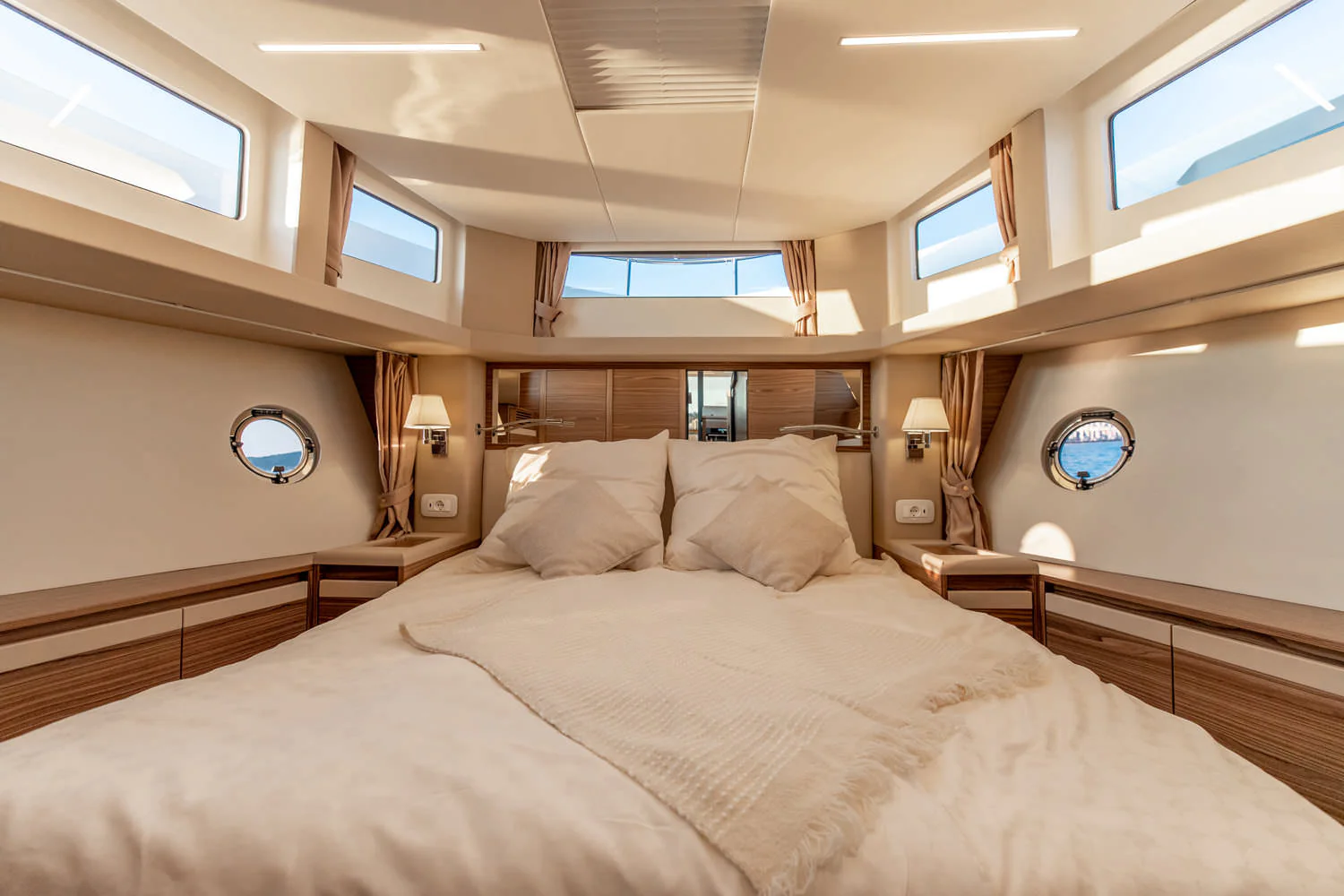 Greenline 45 Fly, hem etkileyici motor seçeneklerinin çeşitliliği hem de gömme dolaplı son derece lüks iki ebeveyn kabini veya iki geniş banyolu üç kabin yerleşim düzeni ile sektöründe benzersizdir.